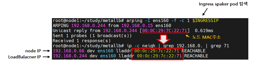 아래 예제는 arpping을 이용하여 nginx ingress controller 서비스를 담당하는 speaker pod를 찾았습니다. 192.168.0.66는 worker2번 노드입니다.