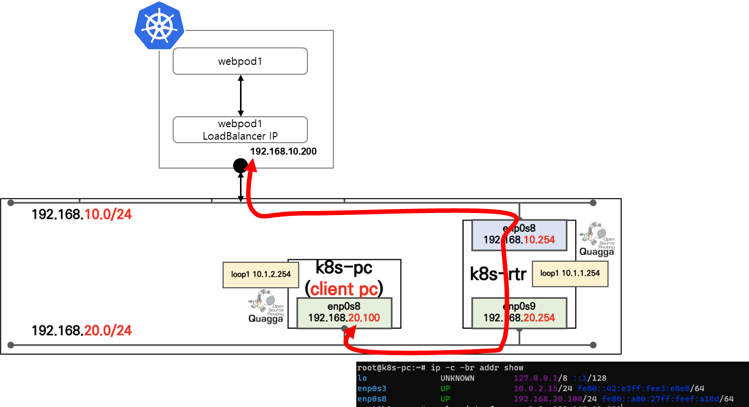 클러스터 외부에 있는 k8s-pc에서 webpod1 로드밸런서 IP인 192.168.10.200을 호출할 겁니다. k8s-pc는 enp0s8인터페이스를 사용합니다.