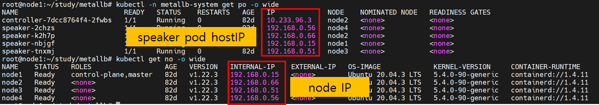 speaker pod의 네트워크 네임스페이스는 host모드로 동작하여 pod IP는 노드 IP를 갖습니다.