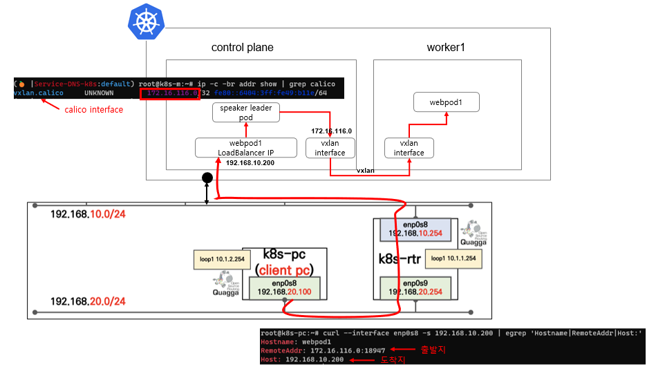 응답을 보면 출발지 IP가 k8s-pc가 아닙니다. 192.1689.10.200을 관리하는 speaker leader pod가 controlaplane노드에 있어서, 출발지 IP가 controlplane 노드에 있는 calico 네트워크 인터페이스로 변경되었습니다.