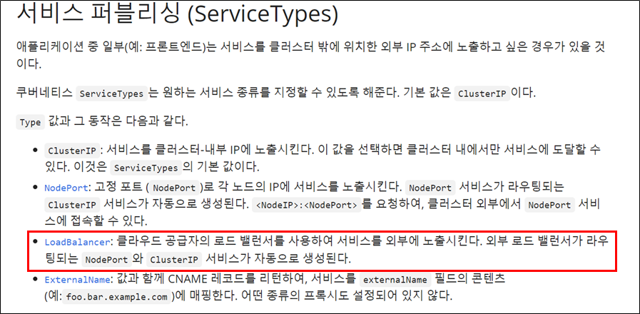 로드밸런서 서비스 타입은 공식문서(https://kubernetes.io/ko/docs/concepts/services-networking/service/#publishing-services-service-types)에서 소개되어 있는 것 처럼, 클라우드에서 제공하는 외부 로드밸런서가 필요합니다.