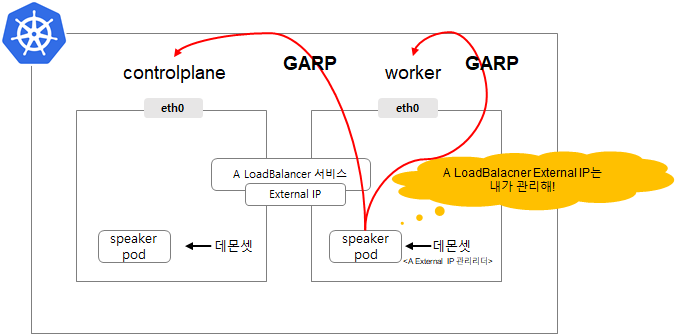 ② GARP프로토콜을 이용하여 speaker pod를 실행하는 노드로 ExternalIP 패킷이 오도록 설정