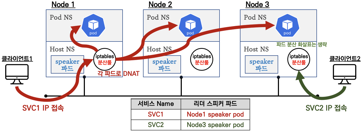 리더 speaker pod이 실행하는 노드로 패킷이 오면, 해당 노드에서 iptables규칙에 따라서 분산되어 패킷이 pod로 전달됩니다. 노드까지 패킷이 도착하면 이후 과정은 nodeport동작과 비슷합니다. NodePort SNAT이 적용되어 출발지(클라이언트)IP가 sepaker pod로 전달된 노드IP로 변경됩니다.