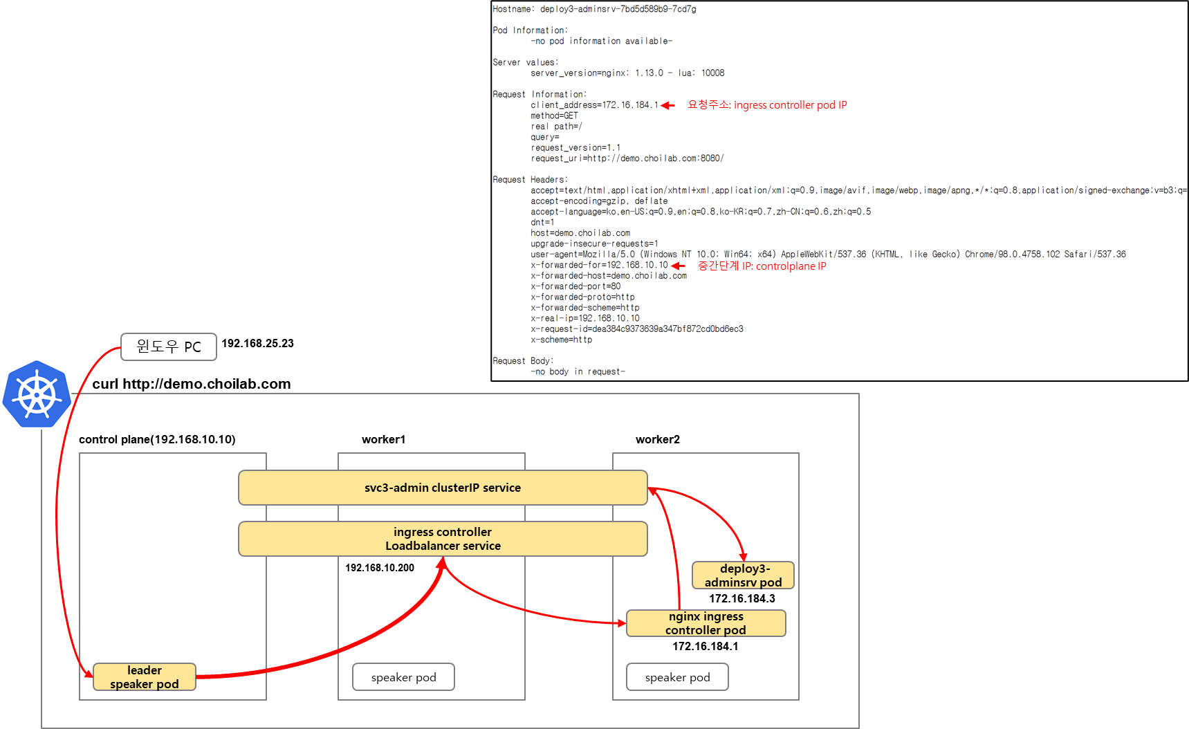 metalLB로 구성했기 때문에 leader speaer pod가 있는 곳으로 먼저 트래픽이 전달됩니다. leader speaker pod가 있는 곳이 controlplane이므로 client address가 192.168.10.10으로 출력되었습니다. 요청PC인 윈도우 IP가 192.168.25.23인데에 불구하고요!