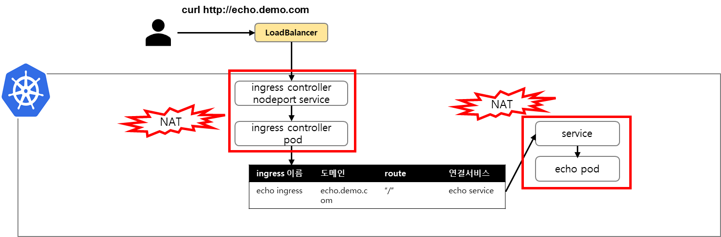 첫 번째 시간에 ingress controller pod가 ingress설정에 따라 서비스로 패킷을 전달한다고 설명했었습니다. 이렇게 네트워크 흐름이 진행되면 생각보다 많은 NAT 작업이 여러번 수행됩니다. 벌써 눈에 보이는 것만 2곳 입니다.