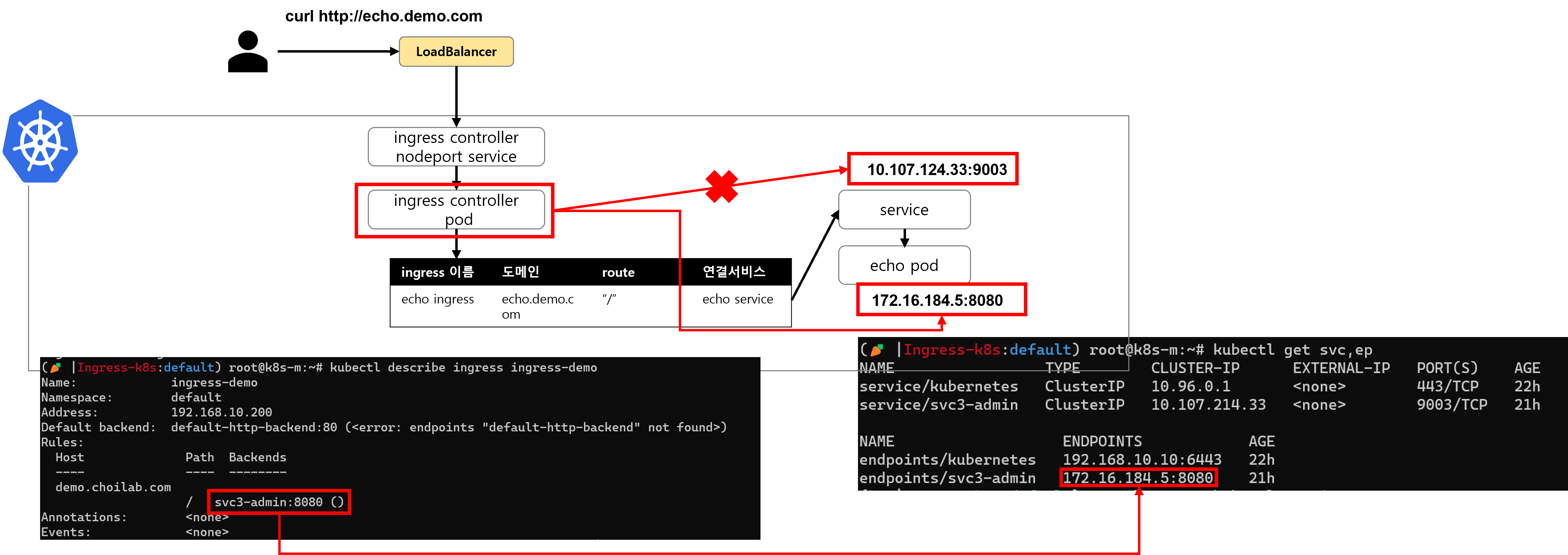 쿠버네티스는 불필요한 작업(오버헤드)를 줄이기 위해 ingress controller가 서비스 endpoints정보를 모니터링합니다. 첫 번째 시간(https://malwareanalysis.tistory.com/277)에서 구성했던 pod를 자세히 보면, ingress가 서비스를 바라보고 있는 것이 아니라 service가 가리키는 endpoints를 바라봅니다.