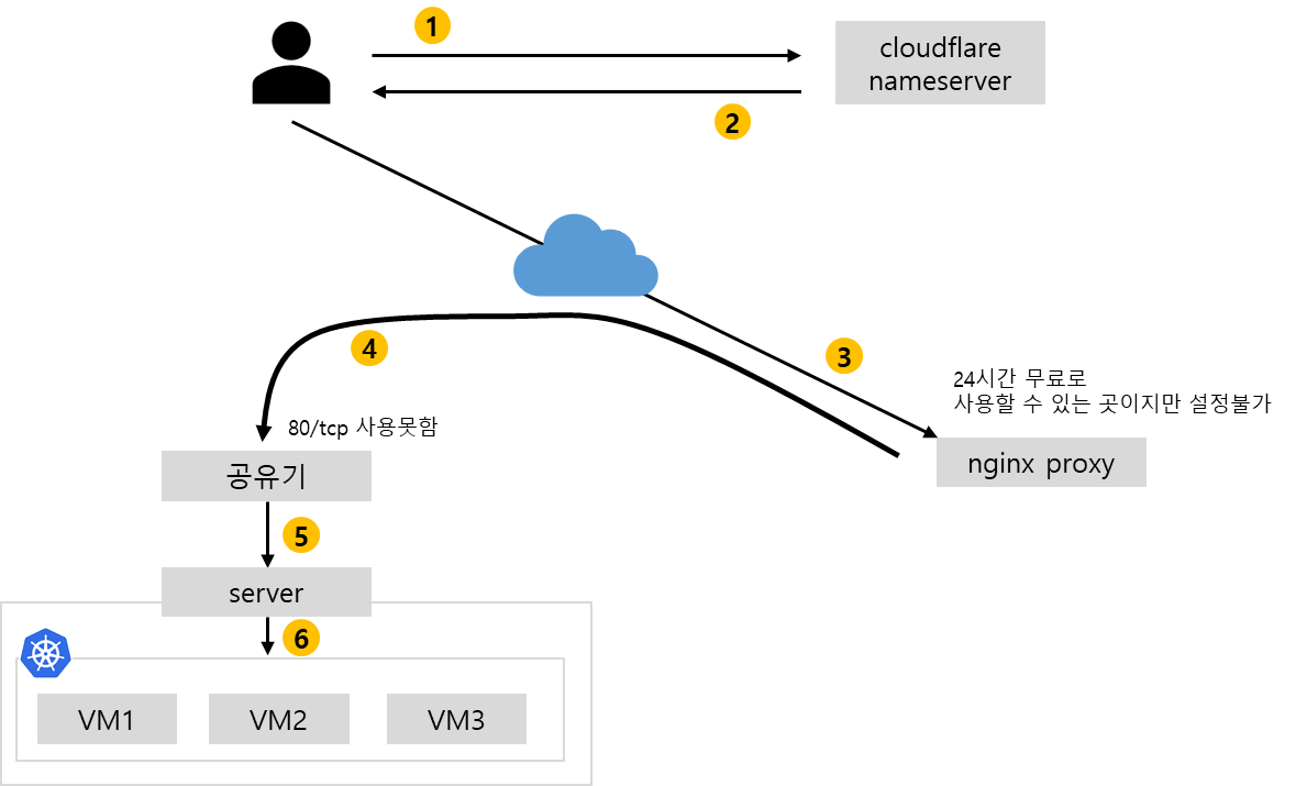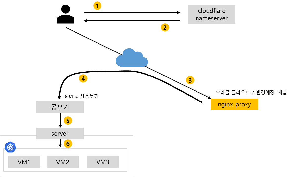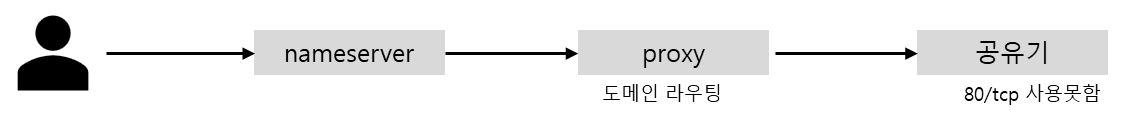 문제는 esxi에 물려있는 공유기의 80/tcp포트를 사용하지 못해, 도메인을 사용(정확히는 80번 이외의 포트를 사용X)하기 위해 프록시를 한번 걸쳐야 했습니다.
