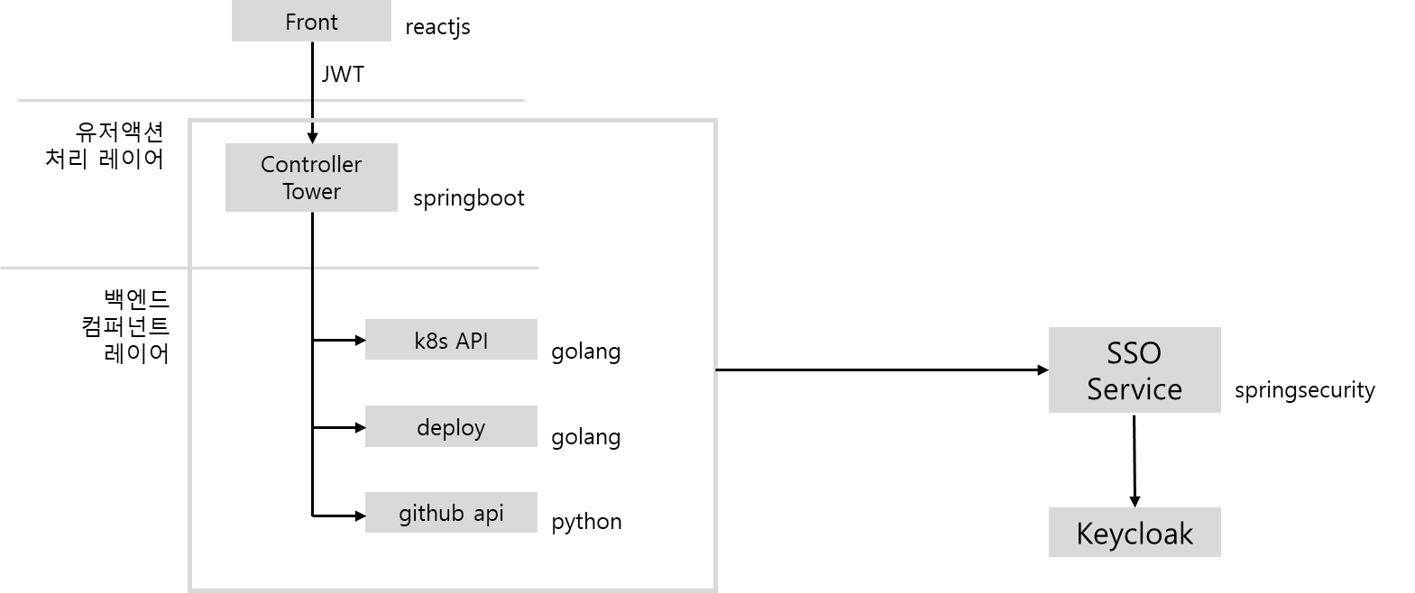 백엔드는 프론트엔드가 전달할 JWT를 검증과 인가확인을 위해 keycloak에 연결될 예정입니다. 백엔드 컴퍼넌트들이 직접 keycloak에 안붙는 이유는 2가지 이유가 있습니다. 인증/인가 기능에 대해 중앙관리하고 싶었고 아직 스터디원 전부 keycloak에 대한 숙련도가 없어서 별도 서비스로 만들기로 했습니다.