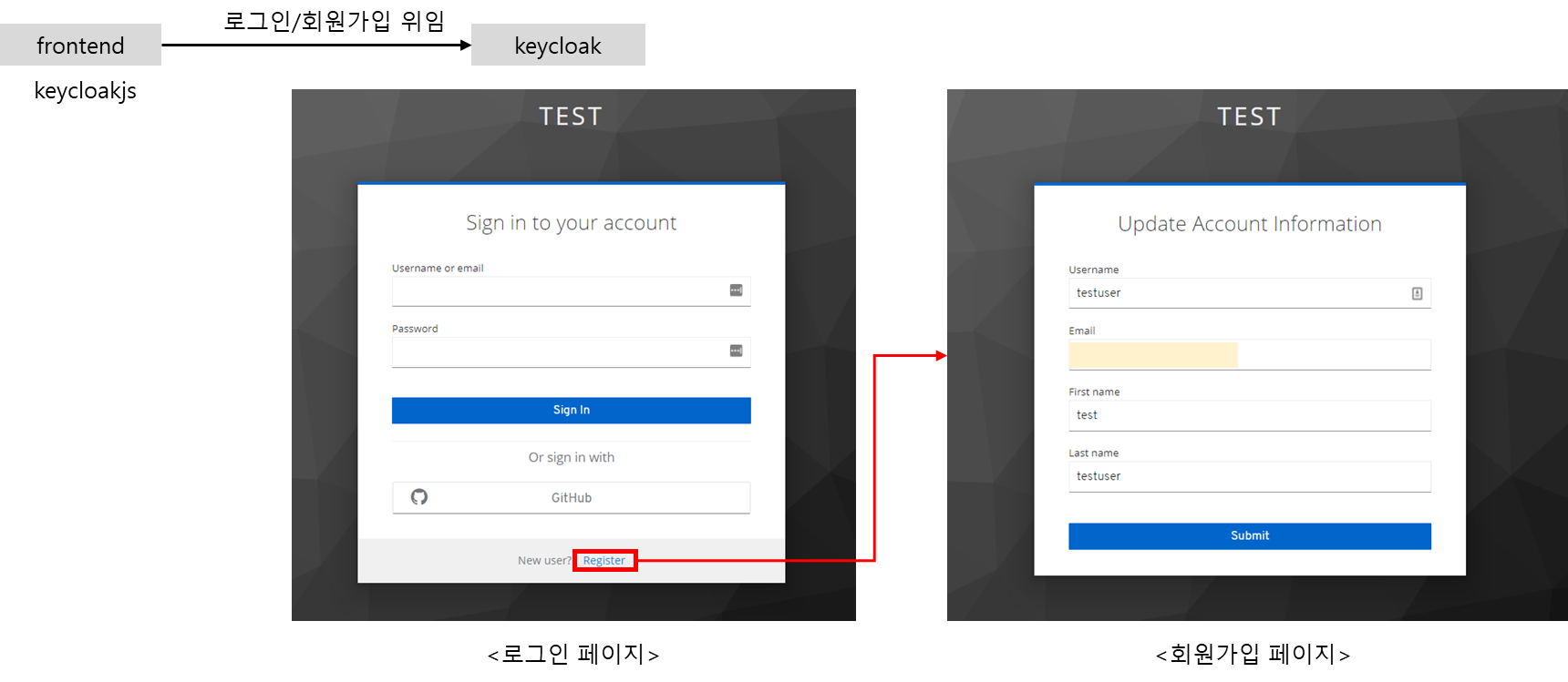 여러 후보가 있었는데 무료로 사용할 수 있고 검색자료가 많은 keycloak을 사용하기로 했습니다. 빠른 구현을 위해 프론트엔드 개발쪽은 로그인/회원가입을 keycloak에게 위임할 생각입니다.