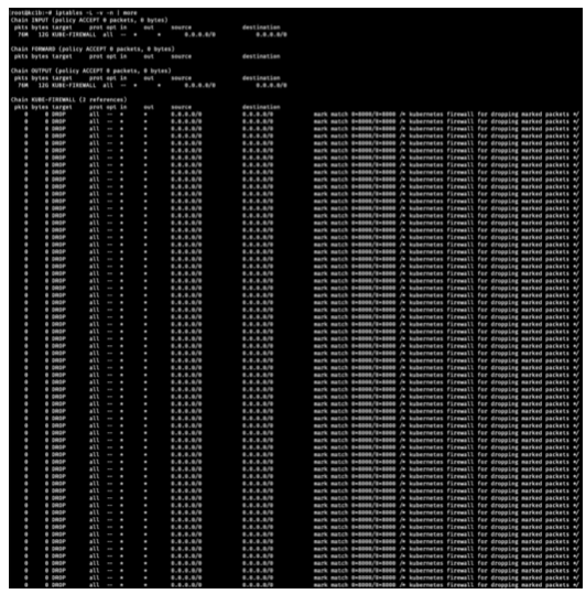 첫 번째 특징은, iptables는 일치한 iptables 규칙을 찾을 때까지 모든 규칙을 평가하는 특징이 있습니다. 파드와 서비스가 많아질수록 규칙을 찾는 시간이 지연되므로 네트워크 성능에 영향을 끼칩니다.