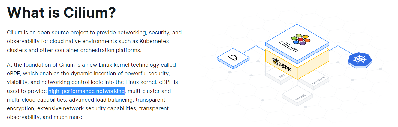Cilium은 공식문서 소개 글처럼 linux eBPF를 이용한 고성능 네트워킹 솔루션입니다. 쿠버네티스에서는 CNI로 동작합니다. 고성능 네트워킹 초점을 둔 이유는 iptables을 이용한 쿠버네티스 트래픽 라우팅의 단점을 보완하려는 목적이 있기 때문입니다.