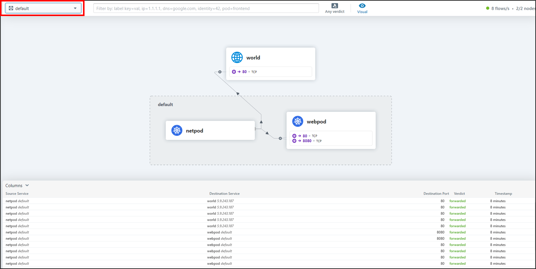 hubble 웹페이지로 접속한 후에 네임스페이스를 default로 변경합니다. 그러면, netpod<->webpod2에서 통신내역을 시각화 한 결과가 보입니다.