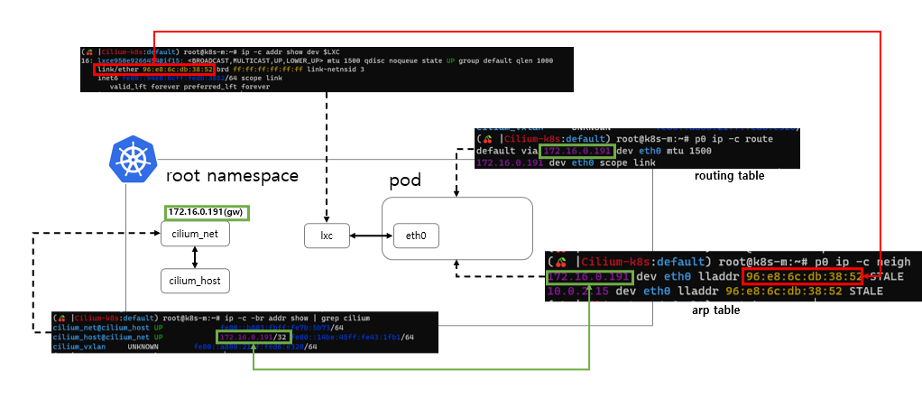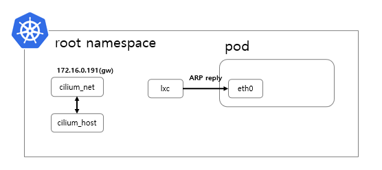 lxc인터페이스는 연결된 파드에게 주기적으로 ARP reply 패킷을 전송하기 때문에, 파드입장에서는 디폴트게이트웨이 MAC주소가 lxc MAC주소로 설정된 것입니다.