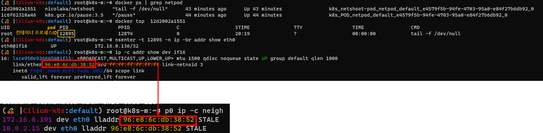 파드의 디폴트게이트웨이는 cilum_net 인터페이스 IP로 설정됩니다. 그리고 MAC주소는 놀랍게도 lxc인터페이스 MAC주소에 해당합니다. lxc인터페이스는 파드가 생성될때 같이 생성되는 인터페이스입니다.