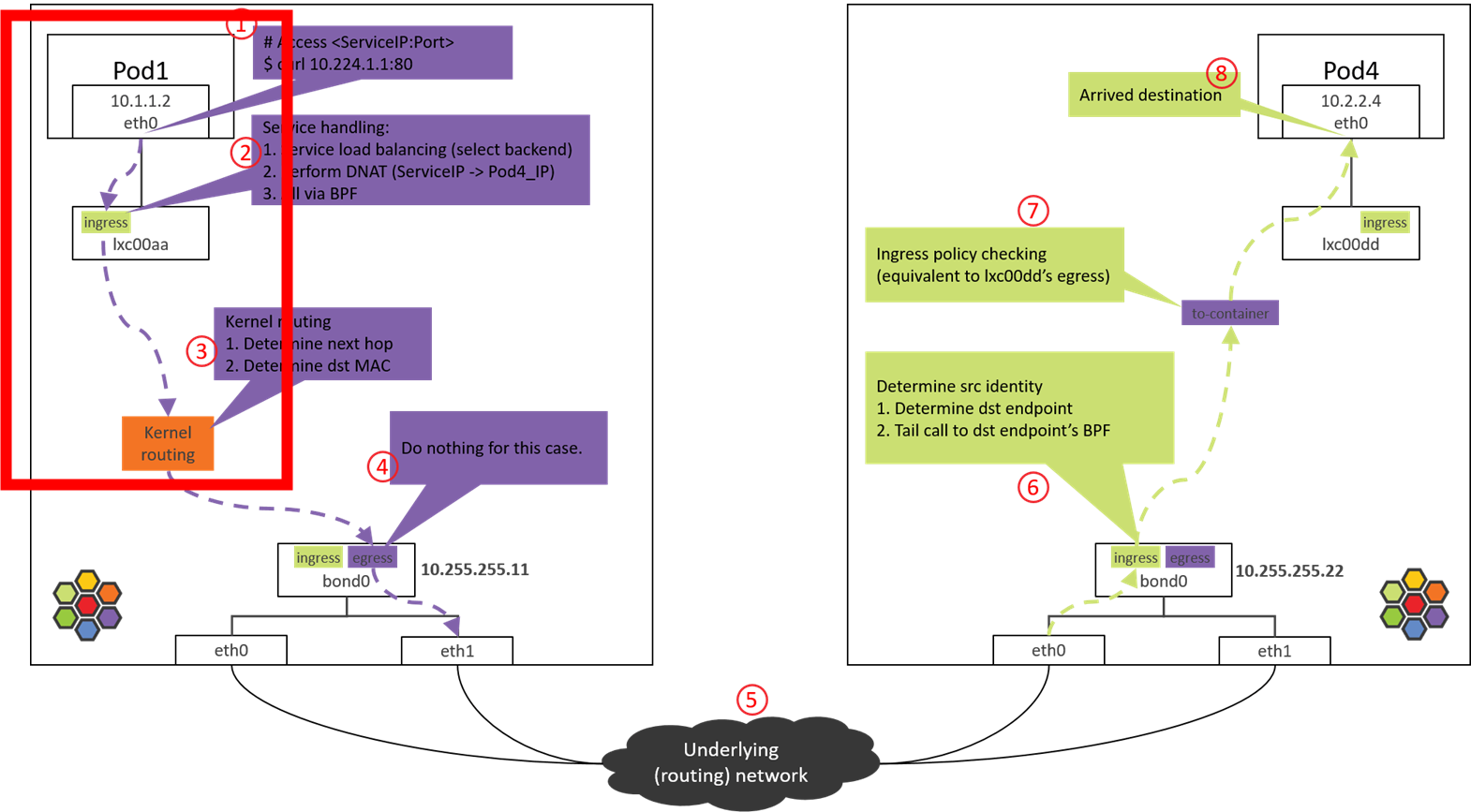 하이레벨 수준은 외국인 블로그(https://arthurchiao.art/blog/cilium-life-of-a-packet-pod-to-service/)에 자세히 설명되어 있습니다. 저는, 네트워크 엔지니어가 아니여서 필요한 부분(빨간색 네모)만 다루고자 합니다.