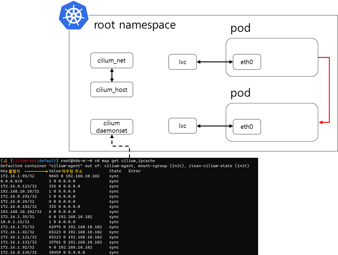 map정보는 cilium get cilium_ipcache명령어로 조회할 수 있습니다.