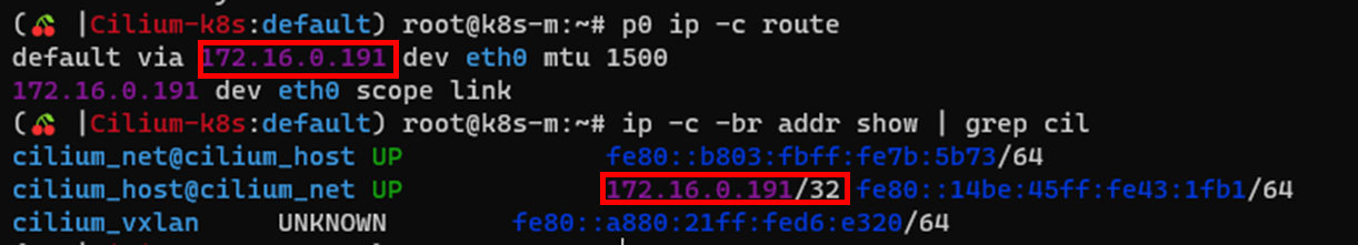 netpod 파드의 디폴트게이트웨이 주소는 cilium_net ip와 일치합니다.