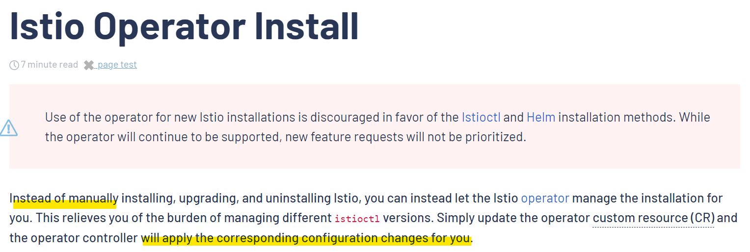 하지만, 운영할 때는 설정을 파일로 관리하는 편이 장점이 더 많습니다. 예를 들어서 kubectl create -f <yaml>처럼 말이죠. istioctl도 istio 설정을 파일로 관리하는 기능을 제공해주는데요. 그게 바로 istio operator입니다. istio operator을 이용하면 쿠버네티스 CRD로 istio를 설정할 수 있습니다.