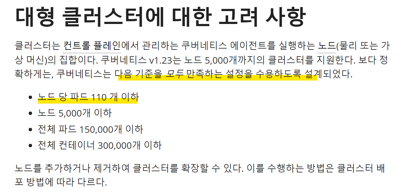 쿠버네티스 각 노드에서 실행할 수 있는 파드 갯수는 디폴트로 110개로 제한되어 있습니다. 공식문서에서도 친절히 설명되어 있습니다. 쿠버네티스가 설치되어 있는 환경에 따라 갯수를 늘릴 수 있습니다.