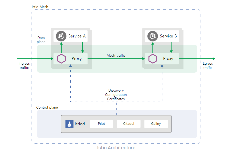 Istio는 Data Plane과 Control plane으로 구성되어 있습니다.