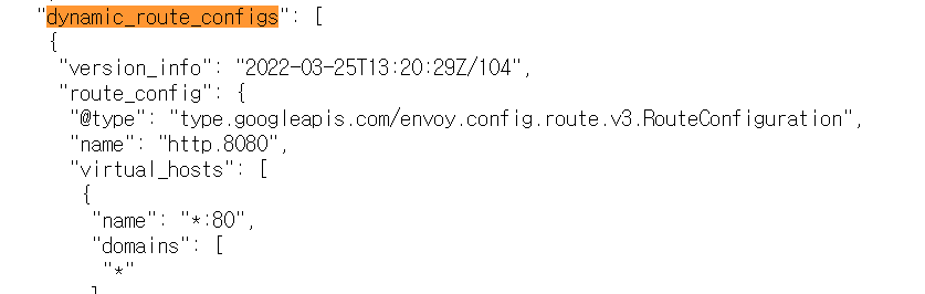 dynamic_route_configs필드가 동적으로 설정되는 값입니다. 지금은 envoy proxy로 접근하기 위해 virtual_hosts가 설정되어 있습니다.