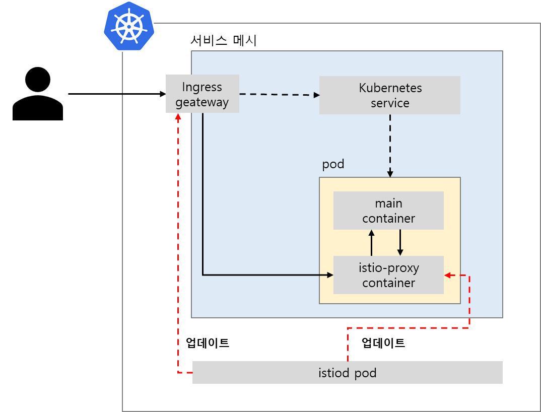 istio가 관리하는 서비스 메시영역은 ingress gateway로 접근이 가능합니다. ingress gateway를 거치지 않으면 일반 쿠버네티스 통신을 따릅니다. ingress gateway는 sidecar로 설치된 istio-proxy(envoy)로 트래픽을 전달합니다. pod에 쿠버네티스 service가 설정되어 있으면, service가 가리키는 endpoints pod정보를 조회합니다. 그리고 서비스를 거치지 않고 다이렉트로 pod로 트래픽을 전달합니다.