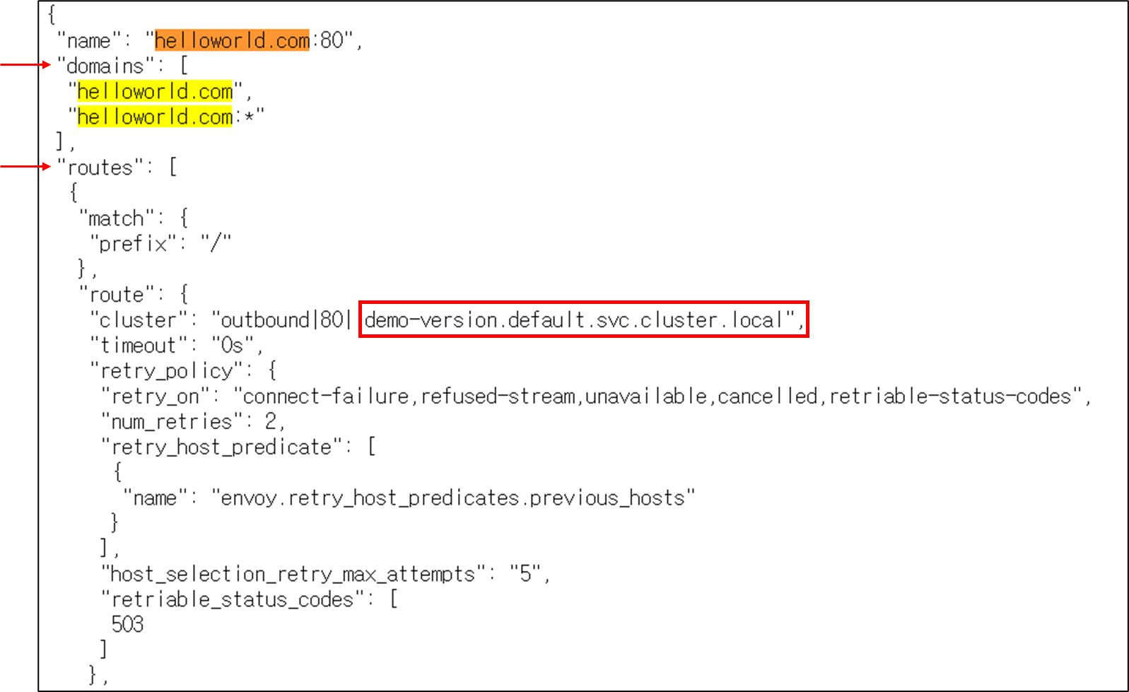dynamic_route_configs필드를 보면 domais과 routes설정이 추가되었습니다. helloworld.com으로 요청이오면 default namespace에 있는 demo-version 쿠버네티스 서비스로 라우팅합니다.