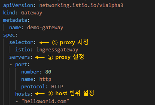 ① selector는 gateway동작을 담당하게 될 proxy를 설정합니다. nginx, envoy등 proxy를 설정할 수 있습니다. 보통 envoy proxy를 사용합니다. ingress gateway는 1개 이상 존재해야 합니다.