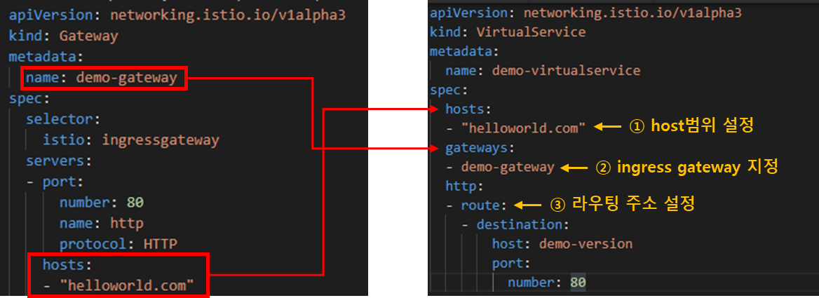 최소 설정은 ingress gateway이름, host범위, 라우팅 설정입니다. 이외에 로드밸런싱 비율 등을 설정할 수 있습니다.