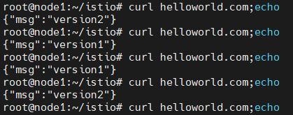 helloworld.com을 호출해봅니다. version1, version2 pod가 번걸아가면서 호출됩니다.
