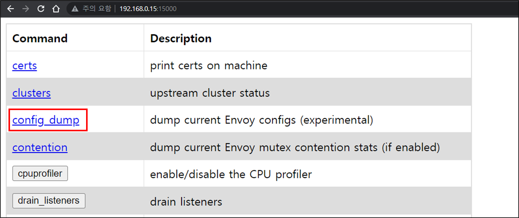 웹브라우저로 접속하면 아래와 같은 화면이 나옵니다. 설정을 보기 위해 config_dump를 클릭합니다.