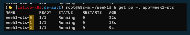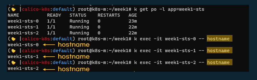 - hostname 이름 규칙: $(statefulset name)-$(ordinal)