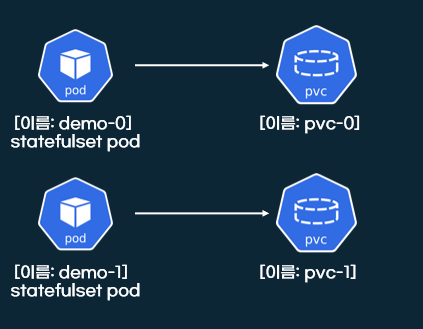 statefulset는 파드가 증가하면, 각 파드는 자기만의 pvc를 갖습니다. 그리고 파드가 재부팅되어도 한번 연결된 pvc로 계속 연결됩니다. 이 구조는 자기만의 스토리지를 필요하는 분산 데이터 저장소에 적합합니다.