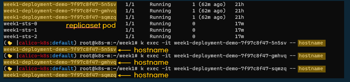 반면 replicaset의 hostname은 랜덤 값이면서 파드가 재실행될때마다 달라집니다.
