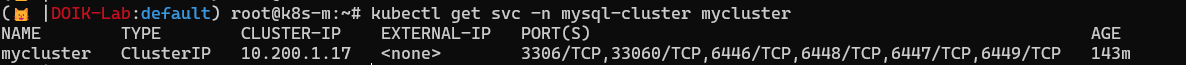 router service이름은 mycluter입니다. 그리고 endpoint주소는 mycluster.mysql-cluster.svc.cluster.local입니다.