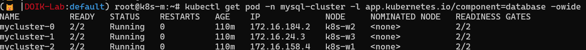 kubectl get pod -n mysql-cluster -l app.kubernetes.io/component=database -owide