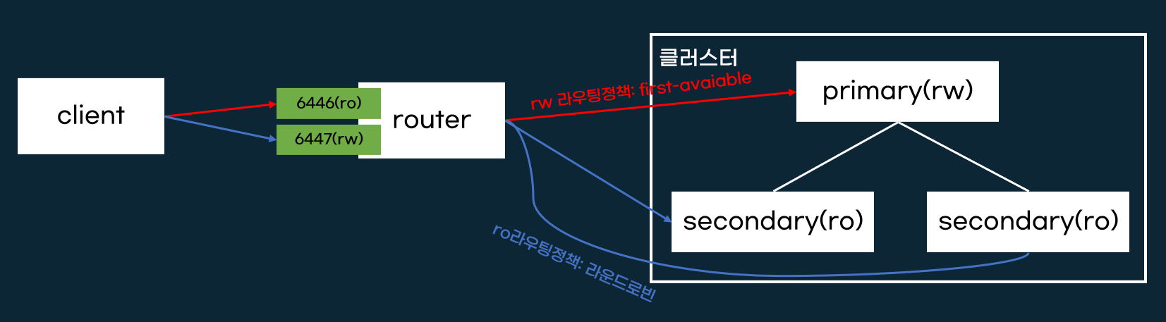 client가 router에 요청할때 6447포트를 사용하면, secondary mysql 2개 중 1개로 부하분산됩니다.
