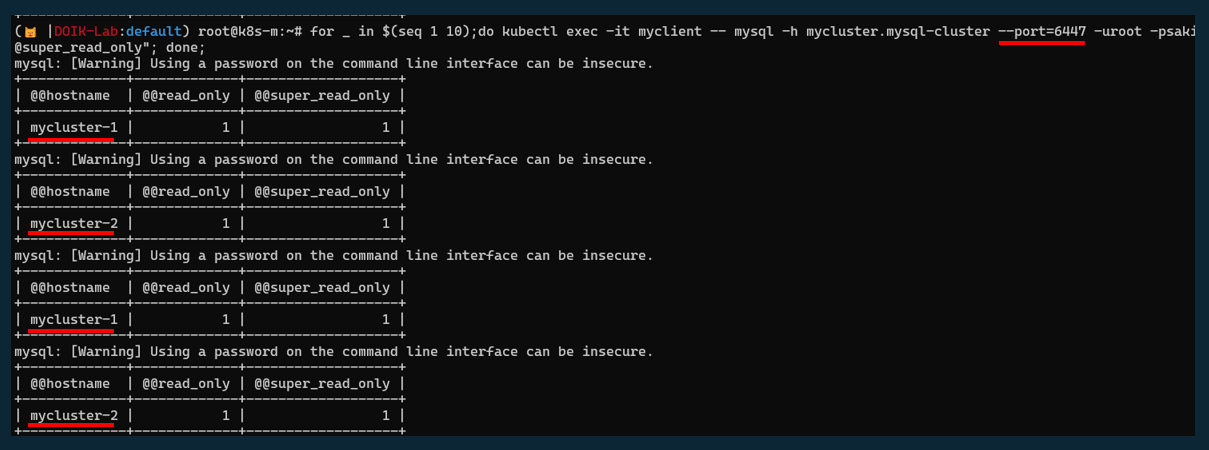for _ in $(seq 1 10);do kubectl exec -it myclient -- mysql -h mycluster.mysql-cluster --port=6447 -uroot -psakila -e "select @@hostname, @@read_only, @