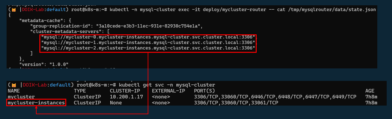 router가 관리하는 mysql인스턴스 목록은 메타데이터 캐시파일(state.json)파일에서 쉽게 확인할 수 있습니다. headless서비스를 이용하여 mysql pod목록을 관리합니다.