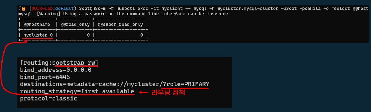 kubectl exec -it myclient -- mysql -h mycluster.mysql-cluster -uroot -psakila -e "select @@hostname, @@read_only, @@super_read_only";echo; done
