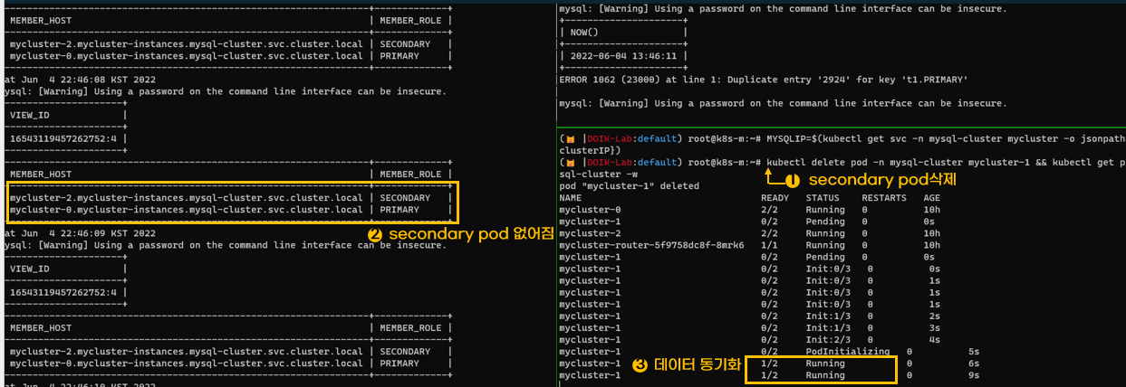 장애가 났던 primary가 다시 클러스터에 조인되면, secondary로 역할이 변경됩니다.