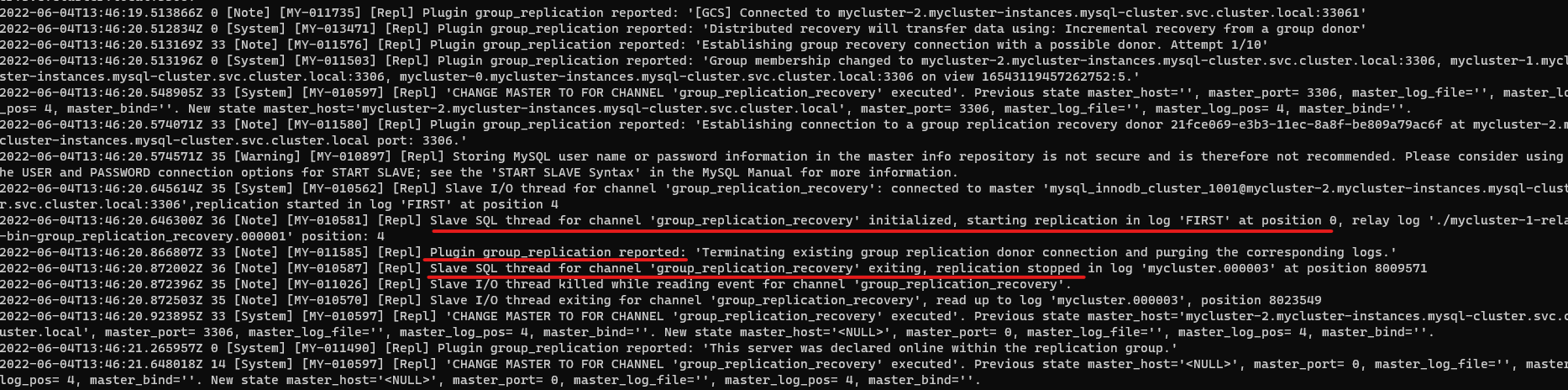 kubectl -n mysql-cluster logs mycluster-1 -c mysql