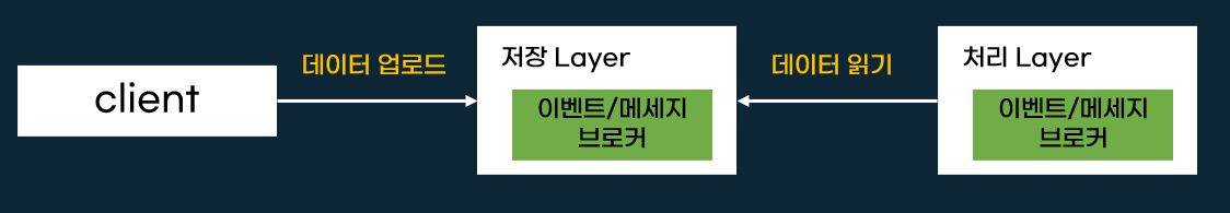 데이터 스트림을 처리하기 위해 2개의 Layer구조(저장Layer, 처리Layer)를 사용하는데요. 저장 Layer에서 메세지/이벤트 브로커를 사용합니다.