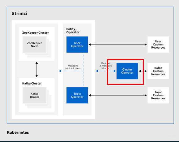 - cluster operator: kafaka cluster, zookeeper cluster 등 컴퍼넌트를 배포하고 관리