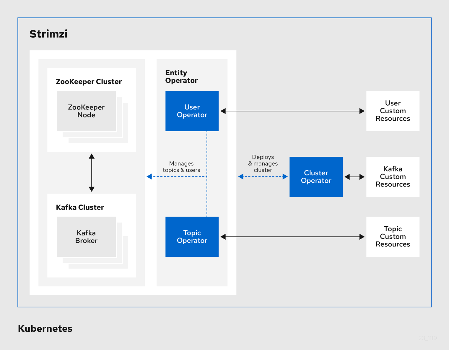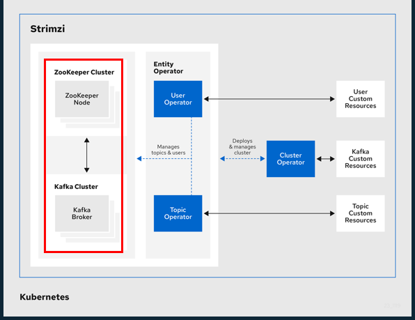 Strimzi crd로 주키퍼 클러스터와 카프카 클러스터를 설치해보겠습니다. Kafka crd를 이용하여 쉽게 설치할 수 있습니다. 아키텍처를 참고하면 cluster operator가 zookeeper 클러스터와 kafka 클러스터를 관리하는 것을 알 수있습니다.
