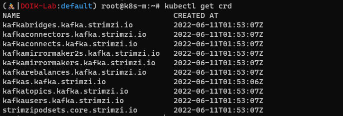 crd도 다수 설치되었습니다. crd는 카프카, 주피커, 토픽 등을 생성, 수정 등에 사용됩니다.