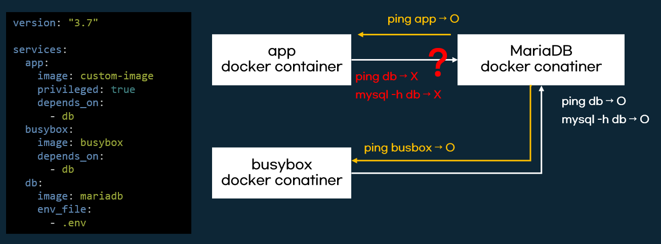 큰 아키텍처는 애플리케이션(app), mariadb를 docker-compose 아래 그림처럼 구성되어 있었습니다.자세한 설정은 보안상 생략했습니다. 애플리케이션→mariadb로 ping이 안되었지만, mariadb→app으로 ping은 되었습니다. 디버깅을 위한 busybox는 양방향 통신이 가능했습니다.
