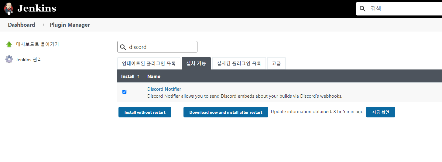다행히 jenkins에서 discord 알림 플러그인이 있습니다. 플러그인 이름은 Discord Notifier입니다.