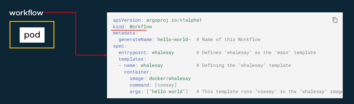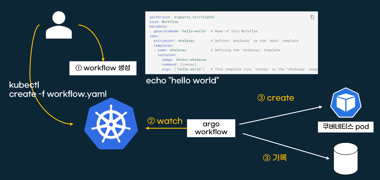 argo workflow는 쿠버네티스럽게 workflow를 생성(CRD)하고 관리합니다. 생성된 workflow는 쿠버네티스 pod로 실행됩니다.