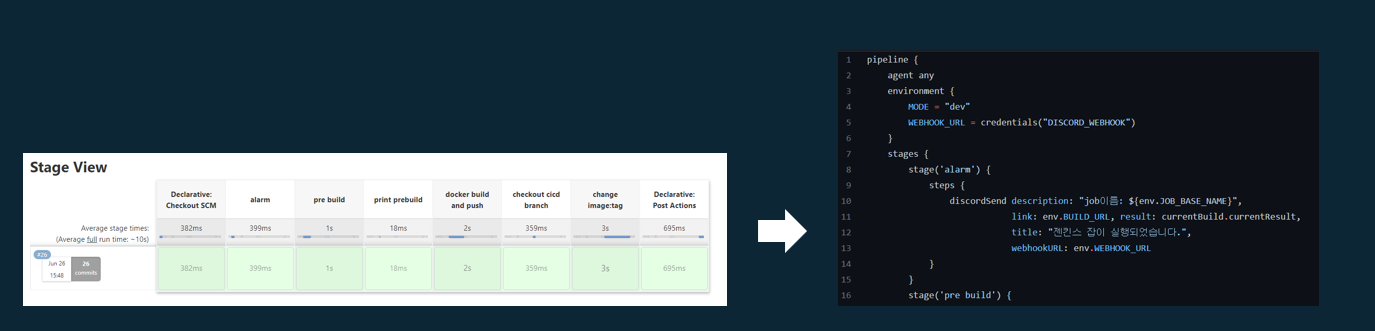 젠킨스를 예로 들면 groovy언어로 파이프라인을 작성합니다.